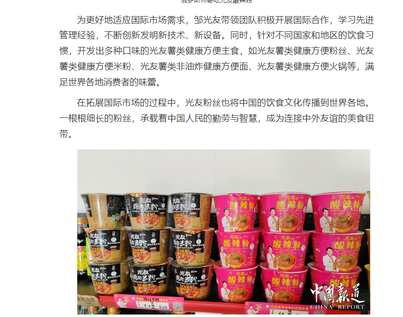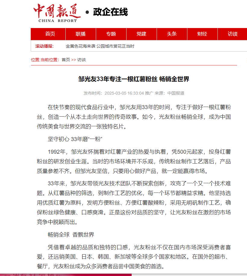 轉(zhuǎn)載中國報道網(wǎng)——鄒光友33年專注一根紅薯粉絲 暢銷全世界