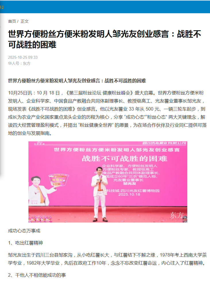 轉載華人頭條-世界方便粉絲方便米粉發(fā)明人鄒光友創(chuàng)業(yè)感言:戰(zhàn)勝不可戰(zhàn)勝的困難